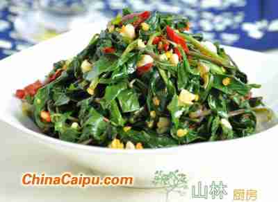 马兰头220克,蒜头3-4头,干椒丝适量,盐糖和陈醋生姜汁麻油食用油各适量。