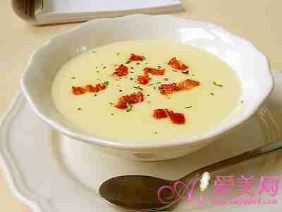4将煮软的土豆和洋葱放进搅拌机,搅拌成泥,再倒回空汤锅,倒入牛奶,盐,黑胡椒粉,不断搅拌直至开锅,再撒上培根即可。