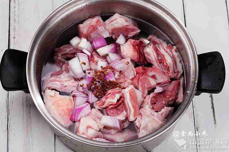 2羊排放入冷水锅中,水一定要浸过羊排,加入花椒和洋葱粒,开大火