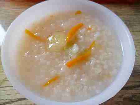 4)当糯米熬成稠状的粥里加入葱白和姜再煮5分钟