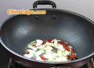 2起油锅,爆香花椒蒜姜八角干辣椒葱白。