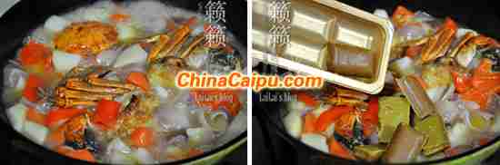 ↓4.翻炒至用料表面发软微微焦香时,将过油大闸蟹入锅翻炒掂匀,锅内注水,水量以略平于锅内材料为准;