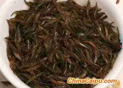 3迅速放入小河虾,轻轻翻炒。放入切好的香葱,加少许白糖生抽调味