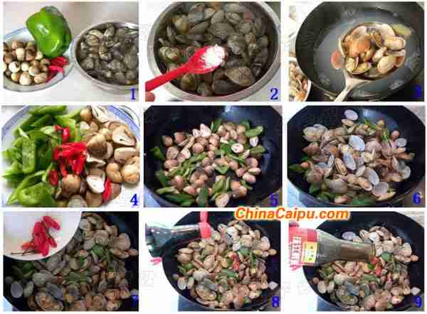 原料草菇100g,花蛤半斤,青椒一个,红尖椒3,4个