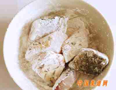3碗内放入玉米淀粉,将鱼块放入粘上薄薄的玉米淀粉,如果过厚要用手拍干。