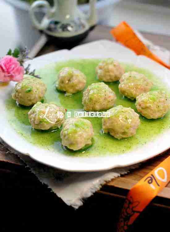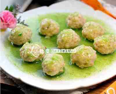 5坐一锅水,水底开始冒小泡泡时,开始汆丸子,左手抓一坨馅,虎口一挤,右手用勺子一刮,一个圆嘟嘟的虾肉丸子就好了。