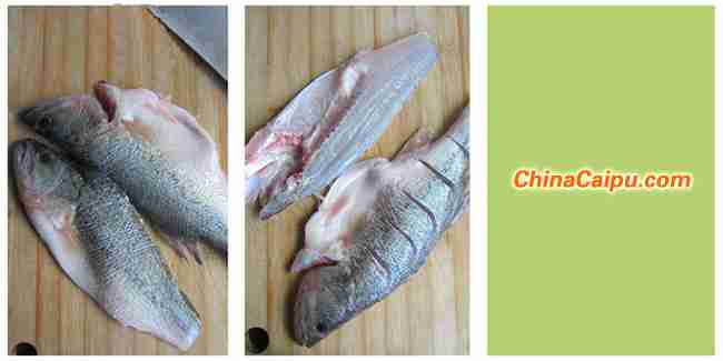 再在雌爿脊部厚肉处向腹部斜剞一长刀,不要损伤鱼皮。