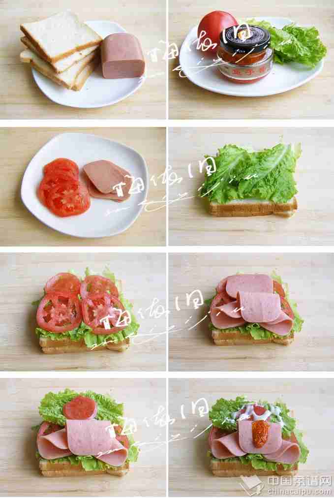 吐司2片鱼籽酱1勺西红柿3片火腿4片黄瓜3片生菜1片。