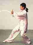 1.丁步抱球重心左移,身体右转,右脚外撇;右臂屈抬,手心向下,左手翻转向右划弧至右腹前,手心向上,两手相对如抱球状;重心右移,左脚收回右脚内侧;眼视右手