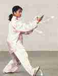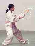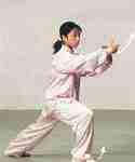 4.上步搭手右脚向右前方上步,脚跟着地;同时两臂交叉,收于胸前,掌心相对