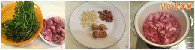 1.排骨斩小块洗净,西洋菜去老根清洗干净沥干;