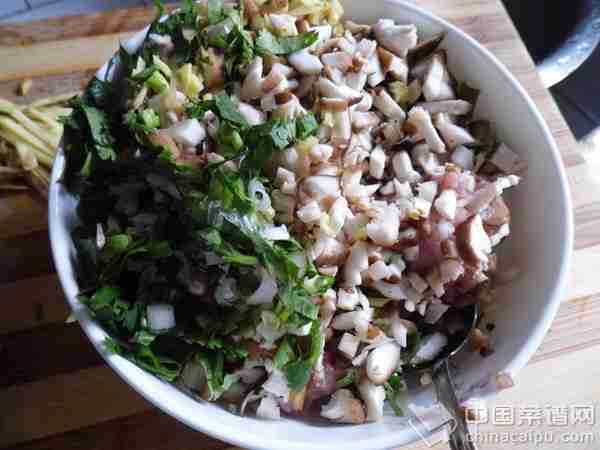 4.猪肉垛成肉糜,加入香菇粒香菜香葱鸡蛋盐胡椒粉蚝油用筷子往一个方向使劲搅拌,直到馅料吸收掉所有水分,并有发泡的感觉