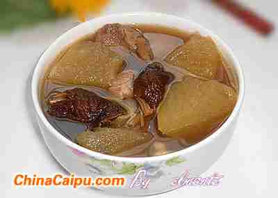 材料冬瓜1块,猪腱600克,茶树菇50克,薏米半碗,盐适量。