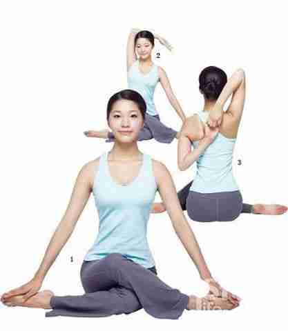 两腿屈膝交叠坐在地上,右腿在上,双手打开放在两侧,指尖点地。你会觉得臀部和髋部得到放松,大腿得到轻微的伸展。保持姿势尽量长时间,至少8~10个呼吸,然后换腿交叉重复动作。