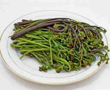 蕨菜又名蕨儿菜﹑龙头菜,在野菜中比较常见。蕨菜叶是卷曲状时,说明它比较鲜嫩,老了后叶子就会舒展开来。