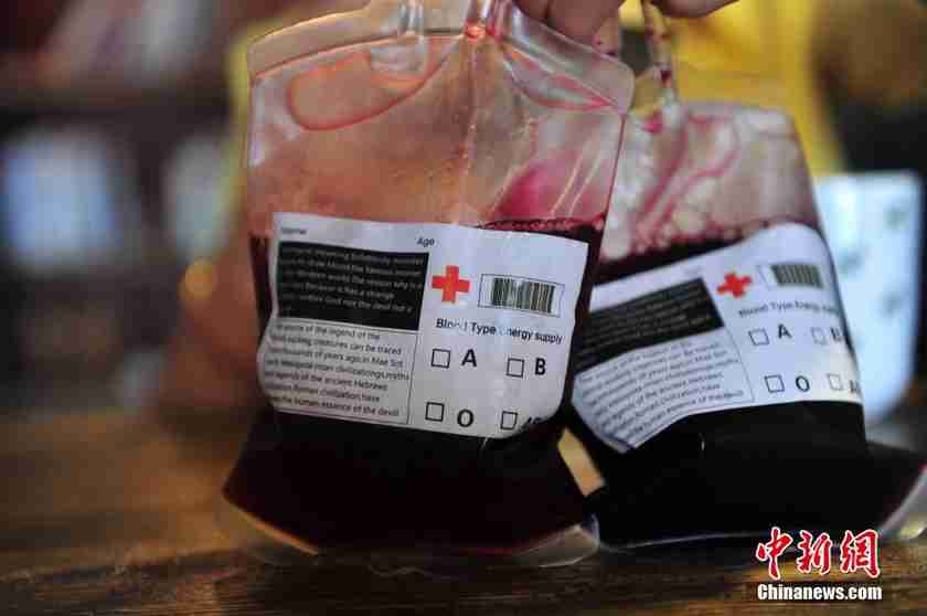 7月6日,市民在品尝“血袋”饮料。当日,在辽宁省本溪市“血袋”饮料成为了一家咖啡店的“明星”,虽然。每袋的价格高达60块钱,依然有很多年轻人怀着好奇心理前来购买。