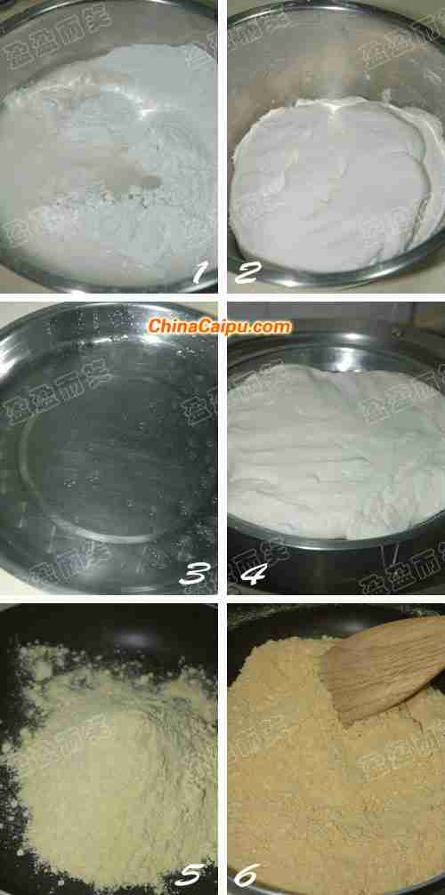 7炒好的黄豆粉,过筛在案板上放凉。面团蒸好后取出,倒在黄豆面上
