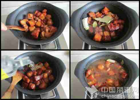 5. 翻炒五花肉块, 直至肉块上色表面微微发焦, 肉块缩小;