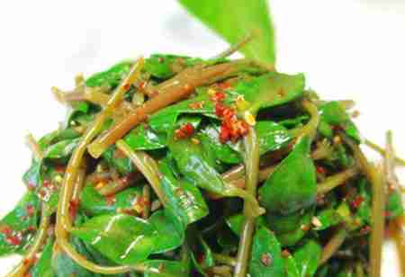 凉拌马齿苋将鲜嫩马齿苋洗净后放沸水中氽一下,然后用清水洗净黏液,切段放入盘中,将蒜瓣捣成蒜泥,倒在马齿苋上,浇上酱油,淋上麻油,拌匀即成。